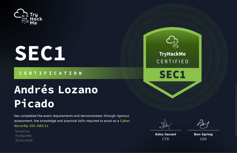 A la plataforma d'aprenentatge en matèria de ciberseguretat TryHackMe, he estat aprenent com vulnerar sistemes operatius, serveis, servidors i fer investigació OSINT entre moltes tàctiques més. Amb l'us d'eines com Kali Linux, he après a fer servir Nmap, Hydra, Burpsuite, Jack the Ripper amb la finalitat de superar cada repte proposat per la plataforma. A més, he estat completant escenaris on simulo ser un Analista de nivell 1 a un SOC (Security Operations Center) d'una empresa.