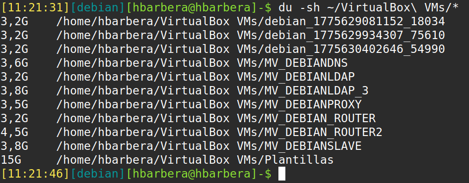 Hem utilitzat l’ordre du -sh ~/VirtualBox\ VMs/* per obtenir la mida de cada directori de màquina virtual. El resum és el següent: