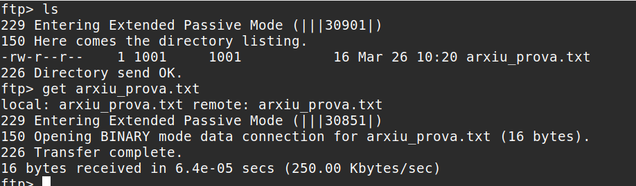 Amb la comanda “get + [nom de l’arxiu]” podem descarregar arxius de l’FTP com podem veure a la captura.