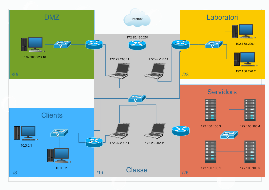 Hem preparat aquest mapa de Xarxa pel Repte. Ha diferencia de l'anterior, aquest té els serveis virtualitzats i també les xarxes internes, les quals treballen amb un hipervisor interconnectades amb el router de la Xarxa de classe.