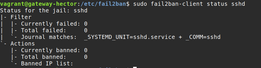 Reiniciem el servei i seguidament, comprobem el estat del Fail2ban al apartat de sshd (SSH)