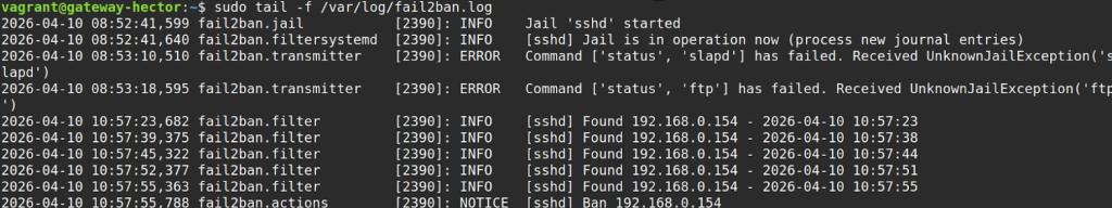 Tot seguit, després de 5 intents a la terminal del servidor. En revisar l’apartat dels logs del fail2ban, podem veure que efectivament s’han detectat els intents i despres de 5 cops se li ha fet un ban a la IP