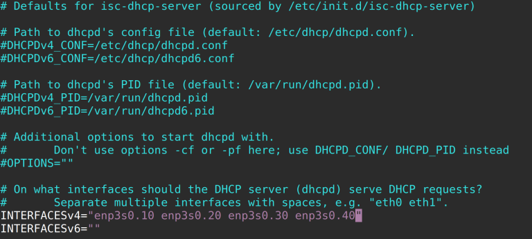 INTERFACESv4=”enp0s3.10 enp0s3.20 enp0s3.30 enp0s3.40″