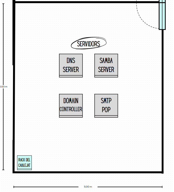 Es una sala no molt gran, amb 4 Racks al mitg i distints maquines amb serveis diferents, el DNS SERVER, el SAMBA SERVER, el DOMAIN CONTROLLER del Active Directory i finalment el servei SMTP/POP. Es indispensable tinde be refrigerada aquesta habitació a 20° graus i fer manteniment regular dels equips. En el nostre context, aquestes màquines són virtuals i no físiques, però en un CPD seria així.