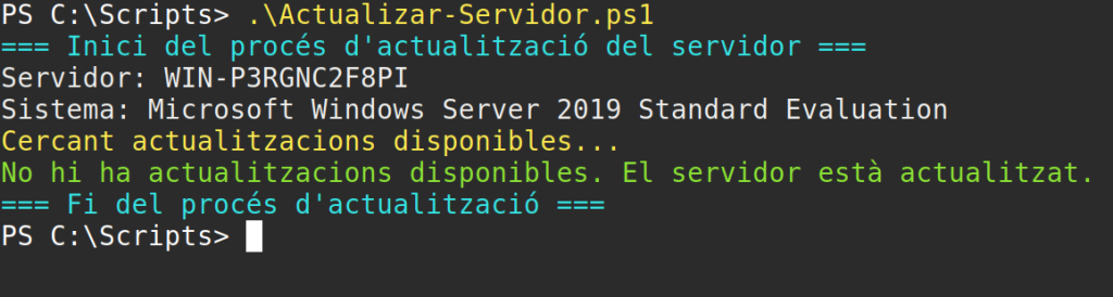 El primer script, actualitza el servidor cercant la versió més recent del sistema operatiu i dels seus serveis. Si troba actualitzacions, les instal·la, però si no és així (com l’exemple) et diu que tot està actualitzat.